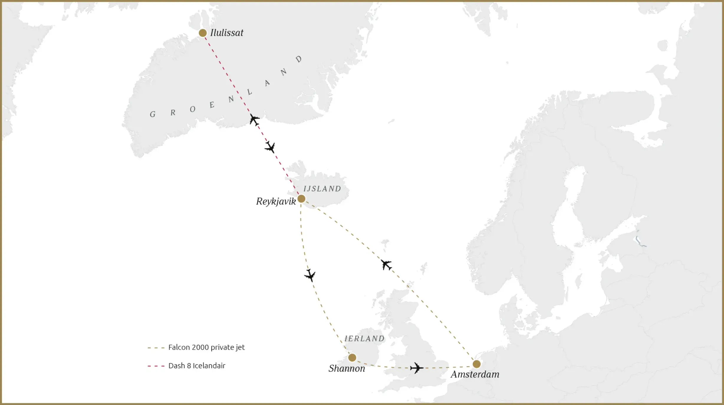 Per privévliegtuig reist u met een select gezelschap van maximaal 20 gasten rechtstreeks van Amsterdam naar IJsland, Groenland en Ierland. De pure en rauwe schoonheid van IJsland vormt een perfecte combinatie met de majestueuze ijsbergen van Groenland. Tijdens deze aircruise ervaart u de magie van de midzomernachtzon te midden van adembenemende landschappen, op een manier die nog nooit eerder in een reis is samengebracht. U verkent deze ongerepte natuur per Super Jeeps, helikopters, quads, Targa- en RIB-boten. U gaat de midzomernachtzon ervaren op een manier die u niet had durven dromen!
